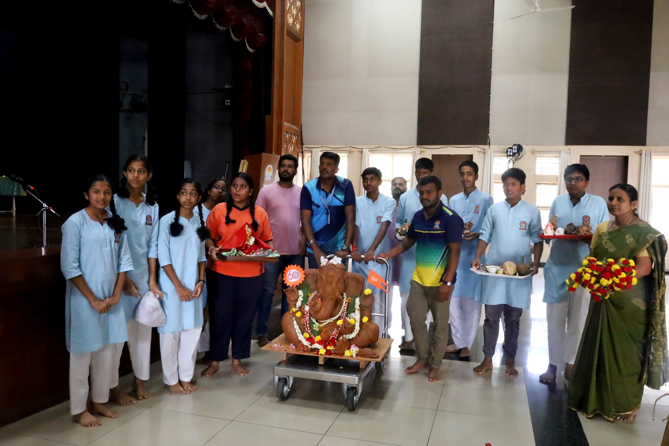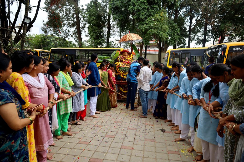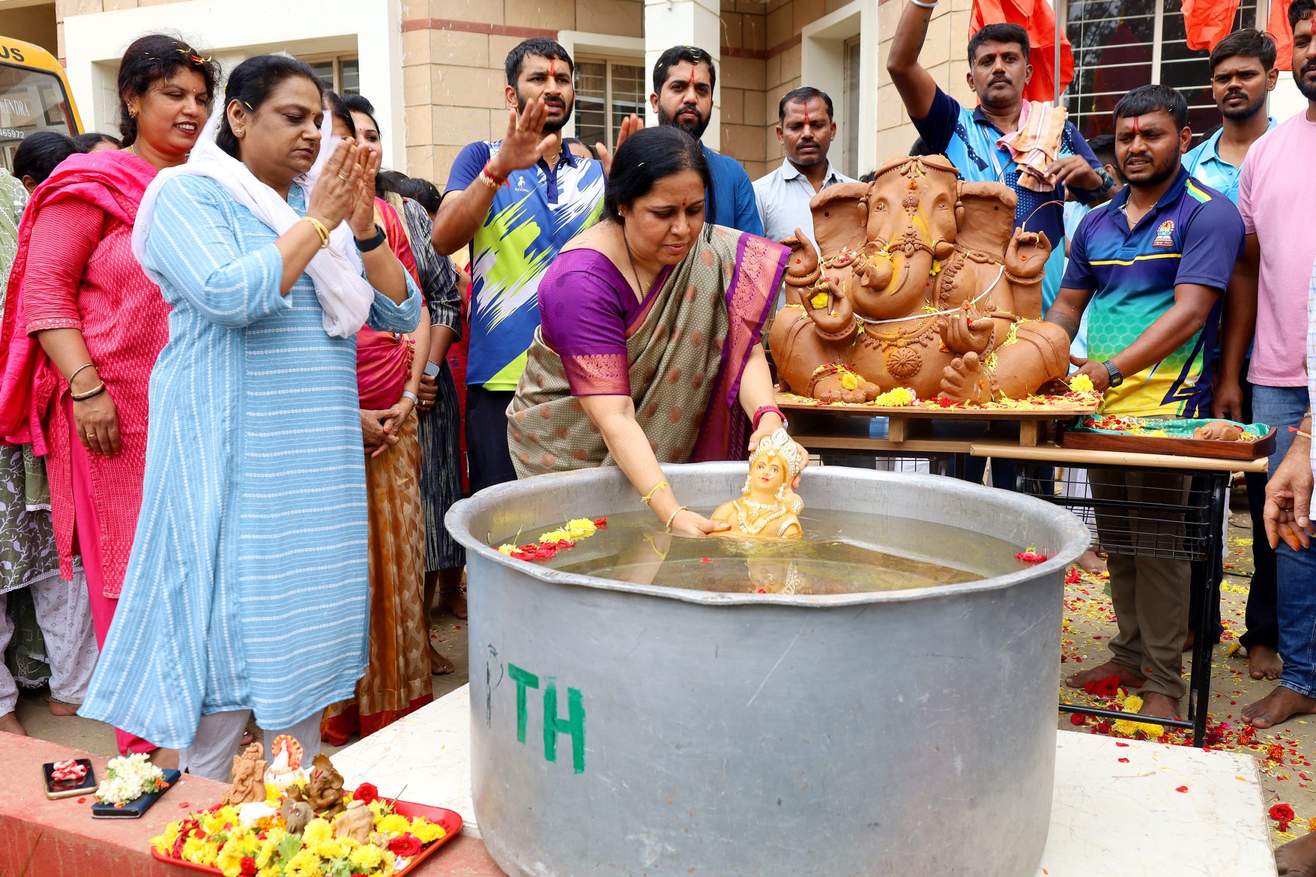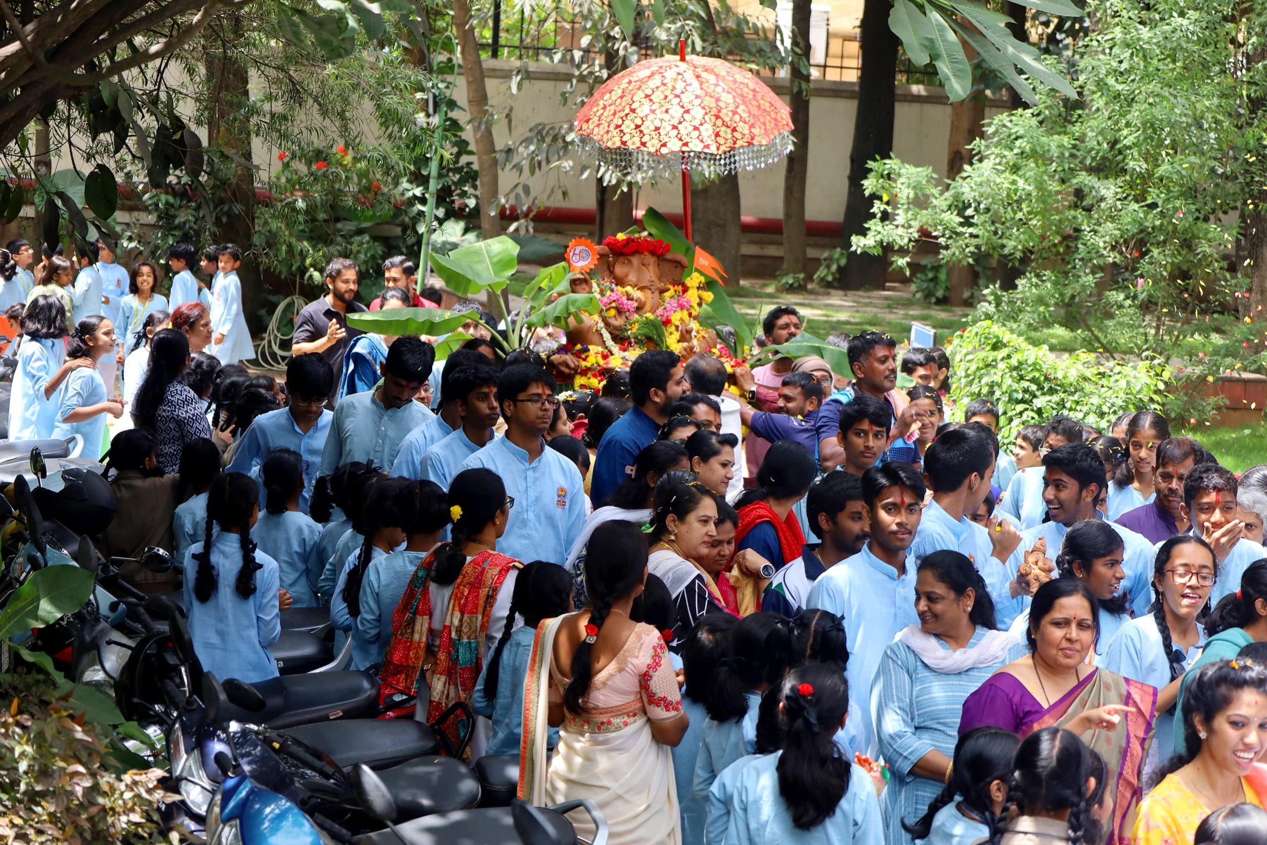 Bengaluru, Aug. 30: The Gauri Ganesh festival concluded with a grand immersion ceremony held in the school premises herein Rashtrotthana Vidya Kendra – Arkavathy. Students from classes 1 to 12, teachers and faculty members participated in the procession. The procession concluded in the school grounds, where the idol was immersed in a large water tank after performing the traditional puja.